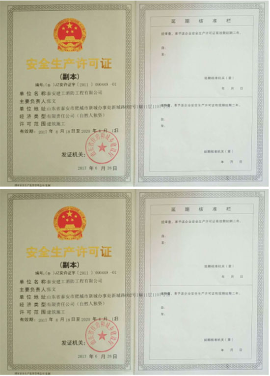 泰安建工消防工程有限公司,注冊成立于 2006 年8 月,注冊資金569 萬元。具有山東省公安廳消防局、山東省建筑工程管理局頒發的建筑消防設施貳級施工資質,2012 年9 月13日取得特種設備安裝改造許可證(電梯),2019 年5月取得建筑消防設施維修保養二級資質。是山東消防協會會員單位,2007 年6月被泰安市工商局命名為市級守合同重信用企業。 公司成立以來,一直奉行“質量第一,用戶至上,社會利益為先”的原則。公司在“重工程質量,創精品工程”的戰略方針指導下,已完成及目前在建的消防工程近百余項。公司下設工程部、技術部、維修部、財務部,工程技術專業人員 42 人。擁有一級、二級注冊建造師6 人,公司經理、技術負責人、財務負責人均具有高級專業職稱,所有技術人員均經省消防局或省建管局專業培訓并持證上崗。主要從事建筑消防設施施工、維護、保養、檢測;乘客電梯、載貨電梯、雜物電梯、自動扶梯、安裝、維修;消防器材、機電產品、礦山機械配件、電梯銷售;消防技術咨詢服務。